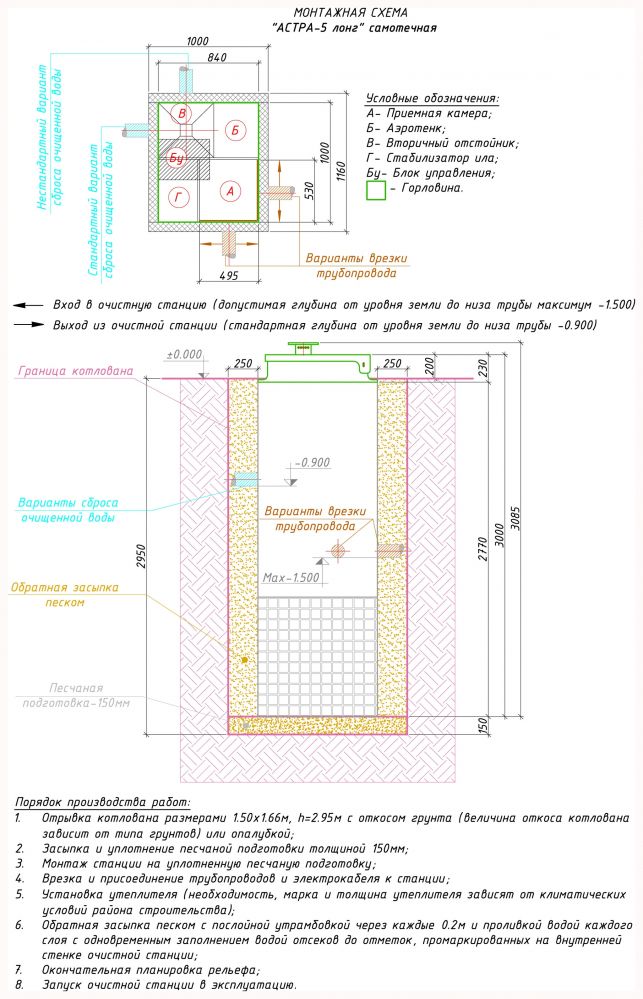 Очистка в септике Астра 5 long производится по той же схеме, что и у большинства аналогичных моделей. Стоки по проложенным трубопроводам направляются в септик. Здесь они попадают и накапливаются в приемном отсеке. Происходит тщательное перемешивание, разделение крупных взвесей на мельчайшие фракции. Далее, подготовленная однородная масса направляется в аэротенк. Здесь под воздействием активного ила, насыщенного кислородом, происходит перемешивание, активные компоненты ила нейтрализуют органические вещества, находящиеся в сточных массах. Далее жидкость перемещается в отстойник. Здесь ил оседает на дно, а очищенные, осветленные водные массы отстаиваются. Далее активный ил возвращается в аэротенк, а вода направляется по отводящим трубам выводится из септика.